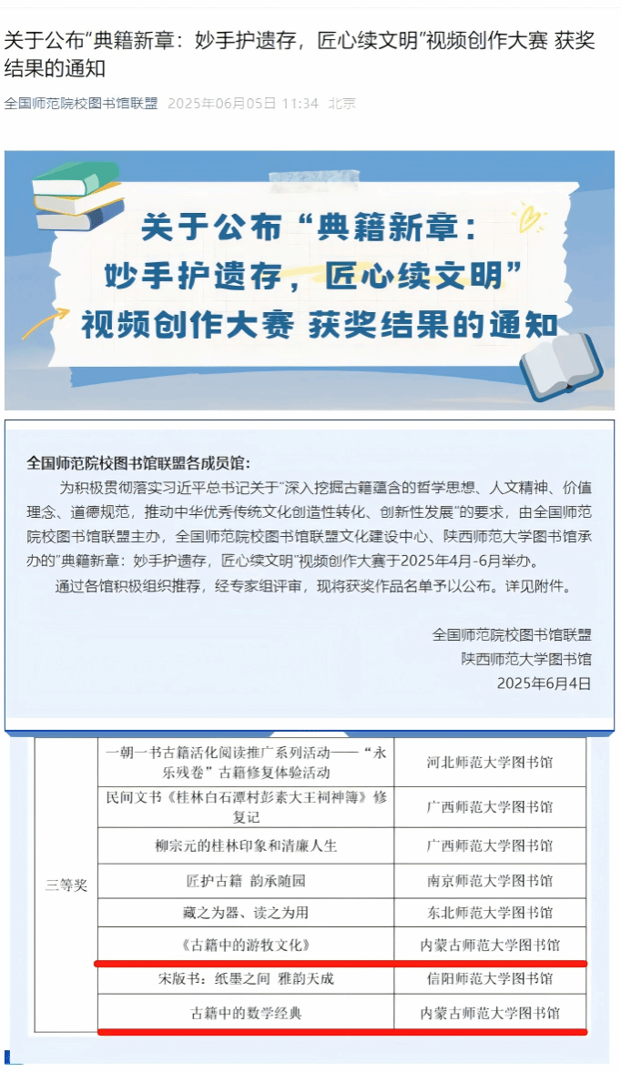 在由全国师范院校图书馆联盟主办,全国师范院校图书馆联盟文化建设中心、陕西师范大学图书馆承办的“典籍新章:妙手护遗存,匠心续文明”视频创作大赛中,我校图书馆参赛作品《古籍中的游牧文化》、《古籍中的数学经典》分别荣获三等奖。