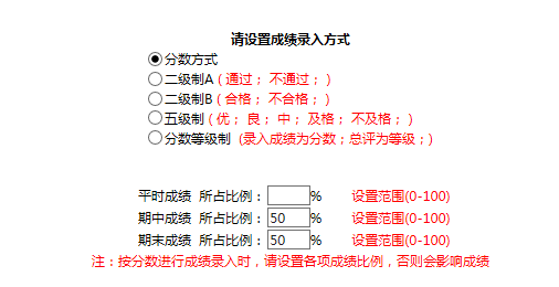 点击“人数”按钮进入成绩录入方式设置界面后,请将“期中成绩”、“期末成绩”所占比例各设为50%,点击“设置”完成。为了成绩统一管理,请将“期中成绩”录入为“内务成绩”,“期末成绩”录入为“队列成绩”,并各按百分制(100分)进行录入。